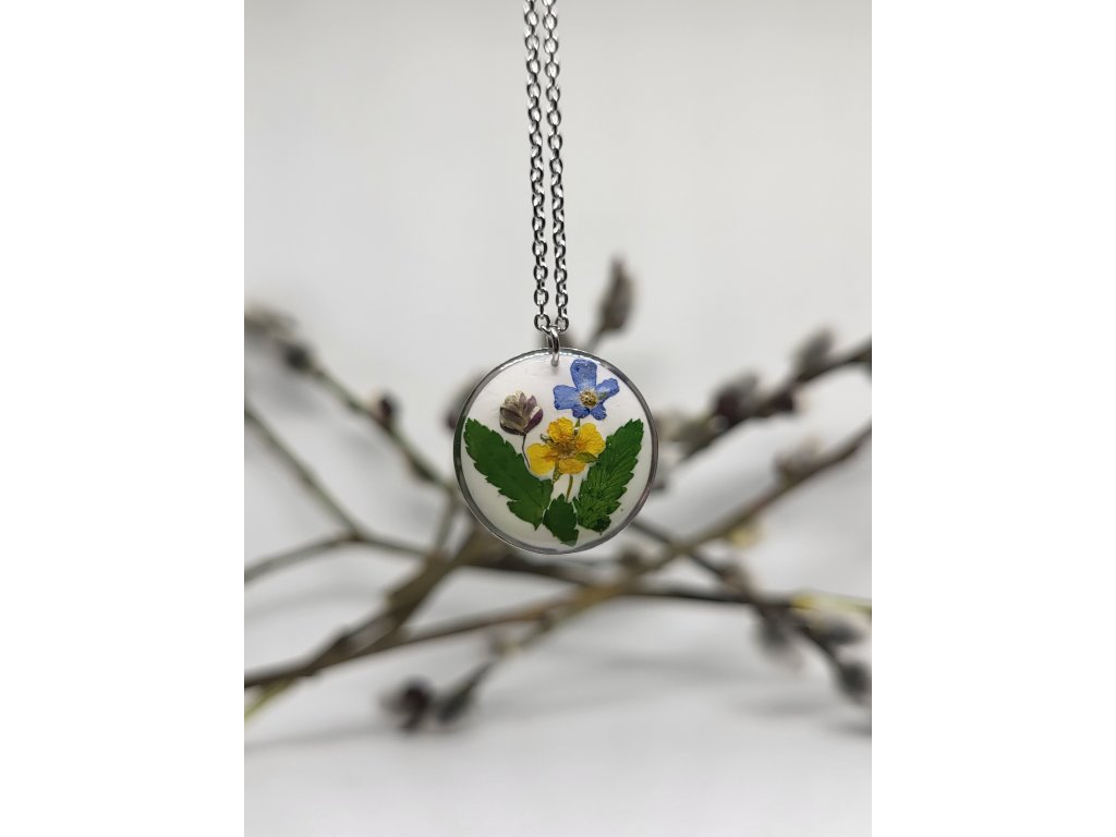 náhrdelník JARO s pravými květy v sobě skrývá něžnost a krásu barev na bílém podloží
